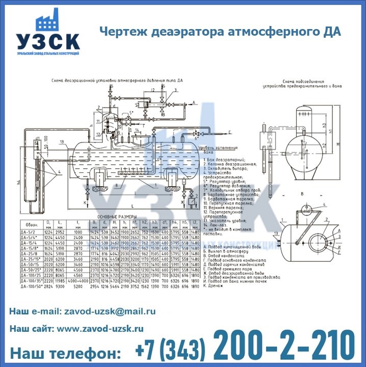 Приобрести качественное оборудование, в том числе, деаэраторы ДА, можно в компании УЗСК в Ставрополе. Мы предлагаем долговечную и надежную продукцию по приемлемой цене. Заказать и купить деаэраторы или другие изделия высокого качества можно через сайт Уральского Завода Стальных Конструкций, или позвонив по указанному в разделе «Контакты» телефону.